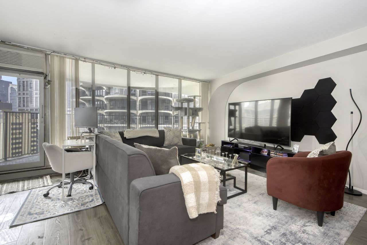 Enjoy one of the best views downtown from the 25th floor of the iconic Marina City Towers. Located in the desirable East Tower this updated 1bed/1bath features TWO large balconies with unobstructed south-facing views of the skyline, Chicago River, and bustling Riverwalk. The living/dining room has wall to wall windows and a huge 20 X 10 private balcony. The spacious kitchen features plentiful cabinets for storage including large pantry cabinet, black granite countertops, and peninsula with additional seating. The bedroom, which has its own 10X9 balcony, can easily fit a queen bed and dresser. The deep walk-in closet and front entry closet offers plenty of storage space within the unit plus one additional assigned 3x3 storage cage included. Marina Towers is a full-amenity building with 24-hour door staff, a fitness center, rooftop deck, party room, valet parking, on-site grocery store/market, dry cleaner, and more. Located in the heart of River North, you're close to the revitalized Riverwalk, shopping on Michigan Ave and State Street, world-class restaurants, theaters, and CTA busses and trains. It's truly one of the best locations in the city for convenience, walkability, and vibrant urban living. Currently tenant-occupied through March 2027.